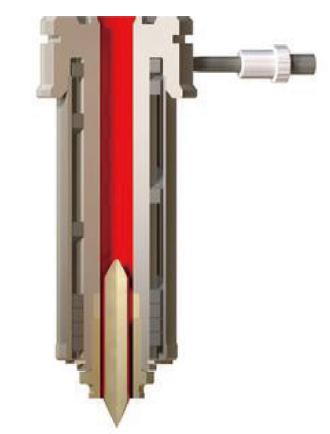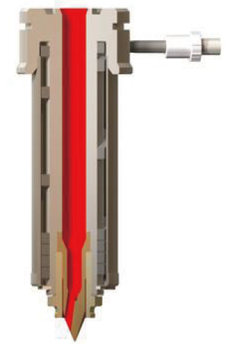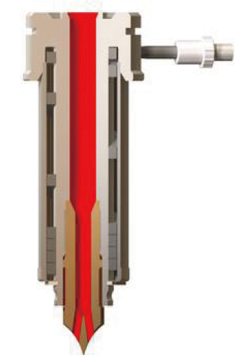 如圖4~圖6側孔式和針尖式噴嘴,常見澆口直徑1~3mm。中央有導流梭針尖防止熔料垂滴和拉絲。較大口徑的澆口,有利于熔體流動充模,也可提高圓錐針尖的強度;較小口徑澆口,在制品上留下痕跡更小,澆口痕跡很難察覺。