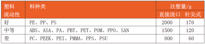 從塑料熔體的黏度,以噴嘴的最大注射量選擇澆口類型,見表1所列。直接澆口允許中等黏度物料1~2kg,針尖式僅100~200g。針閥式澆口介于兩者之間。