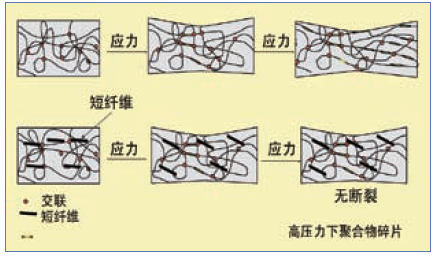 圖2和圖3顯示了短纖維與其它增強材料的不同之處。當高應力應用于具有良好整體分散性的橡膠零件時,該零件將保持其完整性。然而,當相同的力被應用到有分散不良或凝聚顆粒的橡膠部件時,橡膠和粒子之間的界面會發生斷裂,從而導致失效。含有良好分散短纖維的同一橡膠制品在類似的應變下能抵抗斷裂,很有可能在不失效的情況下抵抗更高的應變。