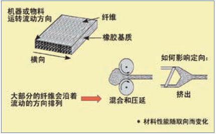 短纖維性能的第二個重要方面是它們在橡膠化合物中的排列。短纖維是各向異性的,這意味著它們的性能在橡膠基體中相對于它們的取向會有所不同。纖維在通過典型的加工系統移動時,傾向于在復合流方向縱向對齊(圖4)。一致性的證據見圖5。在這里,當纖維排列從縱向(流動方向)向橫向(垂直于流動方向)轉移時,模量會顯著地變化。同樣,圖6顯示了纖維排列的縱向和橫向方向之間的表面剛度和阻抗力的變化。其實,較好排列的纖維在一定程度上會作為持續的補強材料。