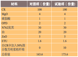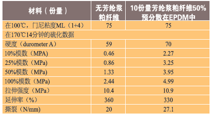 芳綸作為極性材料,將與極性彈性體進行最佳的互動。然而,彈性粘結劑中的預分散芳綸纖維可以很好地分散這些纖維在極性或非極性彈性體中,如表2~表5所示。表2顯示了一種基于氯丁橡膠的橡膠復合配方,一種極性彈性體,具有無預分散芳綸纖維。如表3所示,隨著芳綸纖維的加入,物理性能,包括抗撕裂性得到了改善。