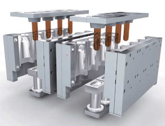 Kavoblow工藝因其活性和生產效率優勢而引人注目。在同一系統內,即可制造諸如非圓形和偏心口包裝以及PET、PP或其它各種不同材料的不同色彩方案。包裝產品可以涵蓋口徑非常小的容器如雪碧瓶,也可用于生產食品工業的大型寬頸容器,口徑介于8毫米至150毫米之間。這一技術的另一大優點在于,與現有機器概念相比,其效率更高、制造成本更低。采用Kavoblow不是逐排生產預制件,而是數排(圖2)一起生產,目前可以生產12至32個空腔,因而可以在短時間內生產多只瓶子或容器。這一工藝特別適合每年500萬至2000萬的產量(或者大多數為3排和4排系統的情況)段,并且擁有以前兩步法系統所具有的高效高品質一步生產的需求。