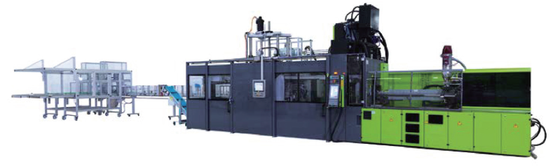 Greiner Packaging是使用一步法的先驅之一。通過與本地一家著名機器制造商合作,Greiner Packaging改進了一步法注拉吹成型工藝并提高了效率,其成果被稱為“Kavoblow”系統。Kavoblow系統(如圖1)將標準注塑機和吹塑成型裝置結合成線性結構。在注射成型后,由快速傳送小車系統將預制件水平轉移至吹塑裝置(標題圖)。