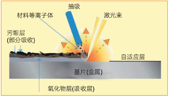 激光清洗是一種只清理污染物的無損處理方法,本體物質不會降解。當光束撞擊被清洗的材料時,它會產生一個高度壓縮的等離子體,通過產生沖擊波來松脫污垢。這個突然膨脹的體積會逐出污染物??焖倜}沖(10 ns)防止發生熱影響(圖1)。