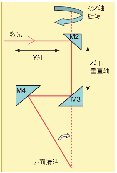 激光束由可移動的旋轉頭和平面鏡提供,允許最大反射1064毫微米。清洗頭沿兩個軸移動。清洗頭可以沿X軸移動575毫米和沿Y軸移動420毫米。在旋轉頭上,光束被重定向到模具(Z軸)??梢苿宇^允許激光束在Z軸附近約為15°角范圍到達模具(圖2)。