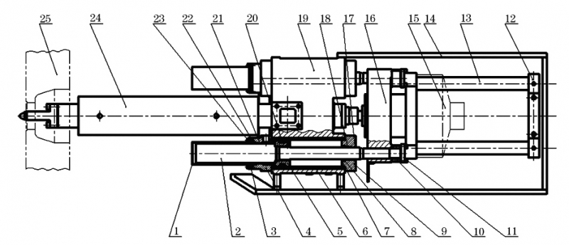1-雙出桿防護罩; 2-雙出桿活塞桿; 3-防塵圈壓蓋; 4-注射前缸蓋; 5-注射活塞; 6-注射油缸; 7-彈簧擋圈; 8-密封圈; 9-注射后缸蓋; 10-注射活塞桿螺母; 11-注射活塞桿壓板; 12-導桿支座; 13-導桿; 14-注射防護罩; 15-預塑馬達; 16-射臺后板; 17-防塵圈; 18-銅套; 19-射臺前板; 20-D-A-S 活塞封; 21-銅套; 22-密封圈; 23-防塵圈; 24-螺桿料筒組件; 25-前模板