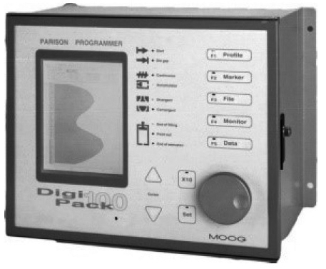 塑料型坯壁厚控制系統基本由以下部分組成:壁厚控制器,油源(伺服液壓站)及過濾器系統,伺服閥及閥座,壁厚液壓缸,位置傳感器(電子尺)。其中關鍵部分為壁厚控制器和伺服閥,是整個壁厚控制系統的核心部件,目前中空成型機行業應用比較多的壁厚控制器是:MOOG,B&R,BECKHOFF,Barber-Colman,上海中船重工704所,等等。目前市場常見的主要是MOOG型坯控制器,這里以MOOG控制器為代表做主要介紹。