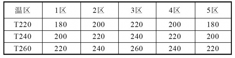 同向雙螺桿擠出機共設5個溫區,如表1所示。