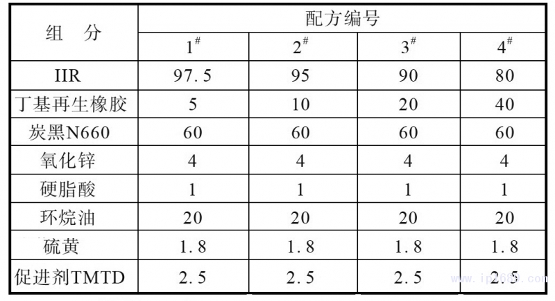 膠料混煉分兩段在開煉機上進行。一段混煉工藝為:IIR→ 丁基再生橡膠→氧化鋅和硬脂酸→炭黑N660和環烷油→出片。一段混煉膠停放24 h后進行二段混煉,混煉工藝為:將硫黃和促進劑均勻混入一段混煉膠中,以1 mm輥距薄通并打5次三角包,然后以2.5 mm輥距出片。二段混煉膠停放24 h后進行硫化,硫化條件為165℃×20 min。硫化膠在室溫下停放12 h以上測試物理性能。