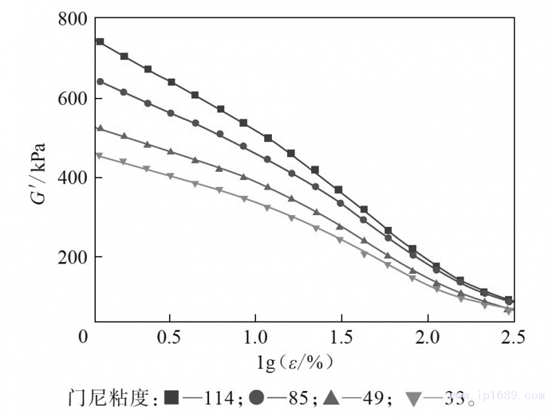 為考察丁基再生橡膠的加工性能,用RPA2000 橡膠加工分析儀對同向雙螺桿擠出機制備的不同門尼粘度丁基再生橡膠混煉膠進行應變掃描,考察儲能模量(G′)與應變(ε)的關系,掃描溫度為60頻率為1 Hz,結果見圖2。
