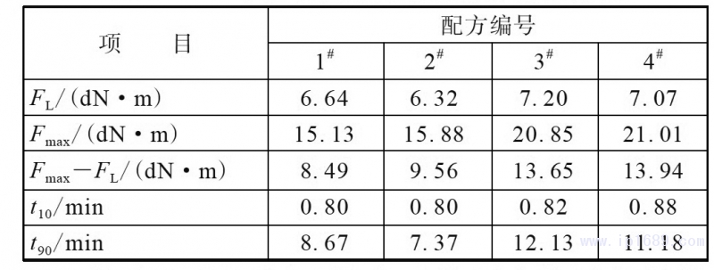 從表6可以看出,隨著丁基再生橡膠用量增大,FL,Fmax和Fmax-FL提高,交聯密度增大,t10和t90總體上也有所延長。
