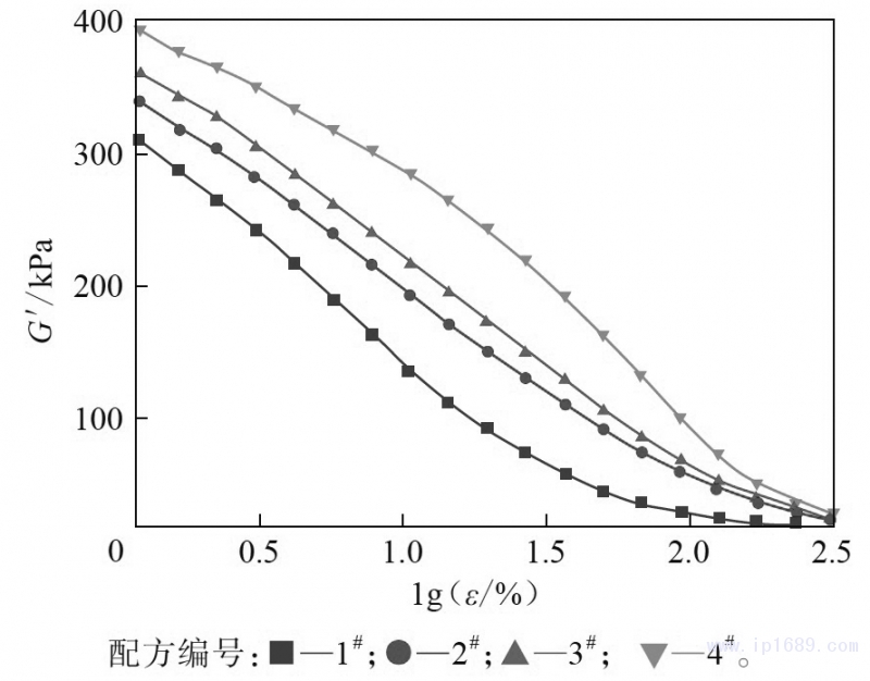 圖2 不同門尼粘度丁基再生橡膠混煉膠的應變掃描曲線