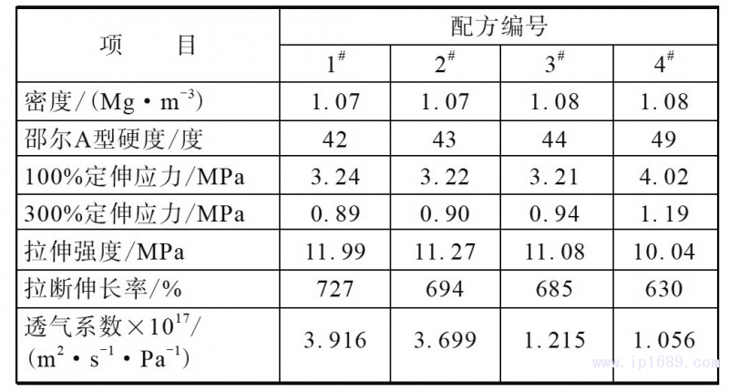 從表7還可以看出:隨著丁基再生橡膠用量增大,IIR/丁基再生橡膠并用膠的透氣系數減小,氣密性提高??偟膩砜?,4#配方膠料的物理性能和氣密性最好。