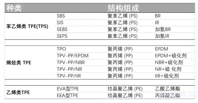 TPE主要由二部分組成,一是塑料,作為連續相,二是橡膠作為分散相。通常橡膠需要與軟化油或增塑劑與之配合。硫化劑和一些輔助助劑也是必不可少的。另外為了降低成本或者提高某方面的性能,一些無機填料也會被填加。根據材料組成可分為:苯乙烯類(SBS、SIS、SEBS、SEPS)、烯烴類(TP0、TPV)、雙烯類(TPB、TPI)、氯乙烯類(TPVC、TCPE)、氨酯類(TPU)、酯類(TPEE)、酰胺類(TPAE)、有機氟類(TPF)、有機硅類和乙烯類等,幾乎涵蓋了現在合成橡膠與合成樹脂的所有領域。下面列舉幾種常見的TPE的組成成分。