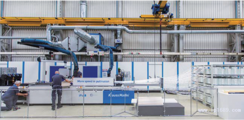 圖4 用于生產纖維增強聚氨酯型材的iPul生產線:在這條完整的生產線中,纖維浸漬在一個封閉的注射室中進行,這樣可以減少工作環境污染并提高生產速度(©克勞斯瑪菲)