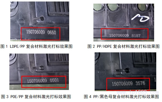 圖1-3分別是四種料共混造粒、注塑成塑殼后的激光打標效果圖,從圖中可以看出四種共混料激光打標后的效果良好,顏色對比明顯,有較好的邊緣清晰度。而圖4,對比四種混合料的打標效果發現,無論是POE、LDPE、還是HDPE與原料和黑色母共混后打標效果并無明顯差異,而且三種共混料與只有黑色母和原料的共混料打標效果相同,因此,可以推測出,部分黑色聚丙烯塑蓋打標失效的原因與原料中混入的色母有關。
