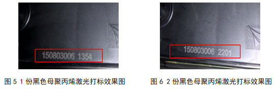 圖5、圖6分別是黑色母與原料比為1:100、2:100的共混聚丙烯塑蓋激光打標效果圖,從圖中可以看出,兩種材料的打標效果基本相同,打標顏色正常。