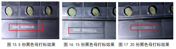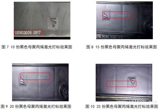 從打標效果可以看出,當色母含量是正常值即5%時,激光打標產生的淺色標記亮度大,對比度高,相對有較好的邊緣清晰度。而當色母含量達到15%-20%時,激光標記依舊清晰,這說明,該種打標粉能有效的改善因色母含量過高而造成的打標失效的現象。
