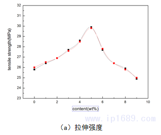 圖18中的(a)(b)(c)分別為添加不同份數色母的聚丙烯材料材料的拉伸、彎曲以及沖擊強度,具體如下所示: