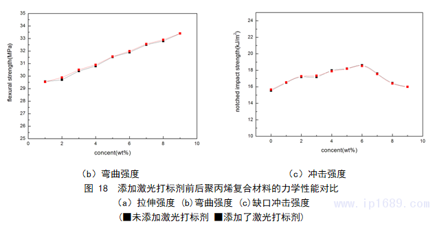 從上圖中可以觀察到,添加激光打標劑前后,聚丙烯復合材料的力學性能變化不大(可忽略不計),也就是說,激光打標劑的加入對聚丙烯復合材料的力學性能幾乎沒有影響。這說明激光打標劑的加入有效的改善了聚丙烯材料的激光打標性能,而并沒有對材料的物理性能產生影響,因此該種材料適合用作聚丙烯材料的激光打標添加劑。