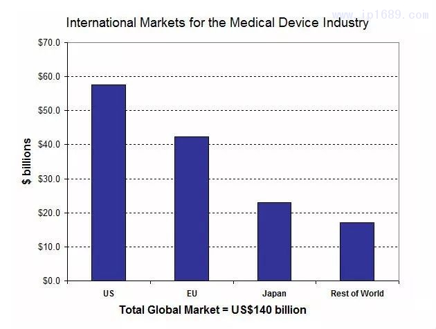 目前全球對這一市場價值的估計仍存在分歧(通常認為該市場市值在1400-1500億美元的范圍內),但目前人們一致認為醫療器械行業最大的市場是美國,其次是歐洲和日本。