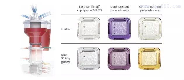 血液治療管理裝置(左)和TrTI共聚酯與聚碳酸酯γ滅菌效果的比較(右)