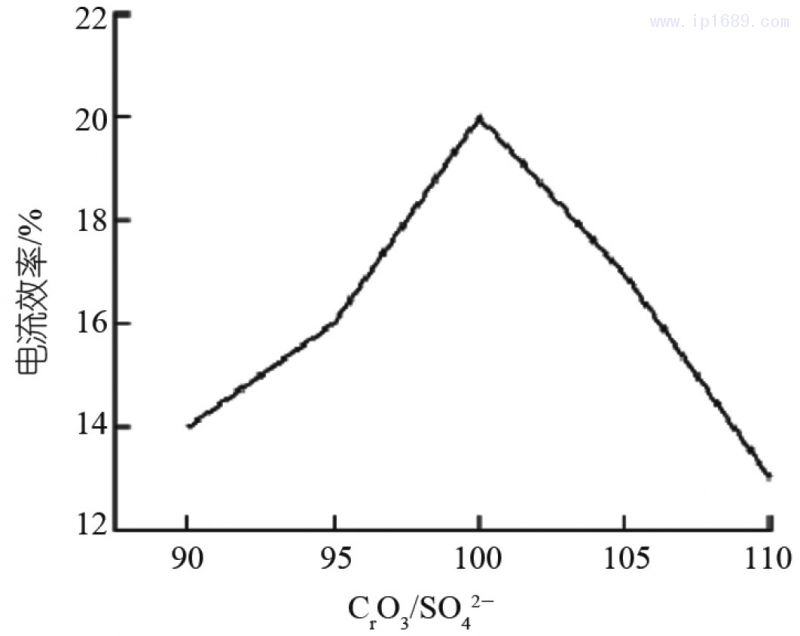 影響很大。當硫酸含量過低時,得不到鍍層或得到的 鍍層很少,主要是棕色氧化物。若硫酸過量時,會造 成覆蓋能力差、電流效率下降,并可能導致局部或全 部沒有鍍層。在確定了鉻酐的質量濃度的基礎上,探 索合理的鉻酐與硫酸的質量濃度比。圖 4 為鉻酐與硫 酸的質量濃度比對電流效率的影響。從圖中可知,當 CrO3/SO42- 為 100:1 時,電流效率最高,且鍍層外觀 質量和性能均較好 ;當 CrO3/SO42- 小于或等于 50:1 時,由于催化劑含量偏高,使陰極膠體膜的溶解速度 大于生成速度,陰極電位也達不到鉻的析出電位,導 致局部、乃至全部沒有鉻的沉積,鍍液的電流效率降 低,分散能力明顯惡化 ;當 CrO3/SO42- 大于 100:1 時, SO42- 含量不足,鍍層的光亮性和鍍液的電流效率降 低,得到的鍍層不均勻,有時發花,特別是凹處還可 能露出基體金屬。
