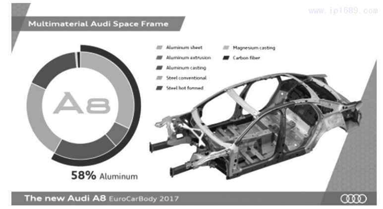 未來的汽車車身將會由多材料體系結構組成的, 如新一代某款奧迪車身材料不再是傳統的白車身了, 而是增加了鋁鎂合金、合金鋼和碳纖維。因此多種材 料的連接將會是工藝制造技術發展的重中之重,工藝 制造分為 4 個專業領域,即沖壓、焊裝、涂裝和總裝。 每個制造過程都會對傳統工藝有所改變,因為在白車 身上變化較大,本文重點闡述沖壓及焊裝的鋁板生產 技術。