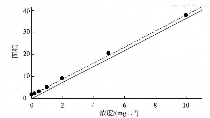 采用T0C、IC標準儲備液100mg/L,將其配制為0、0.2、0.5、1.0、2.0、5.0、10.0mg/L的標準溶液,測相應的峰面積。
