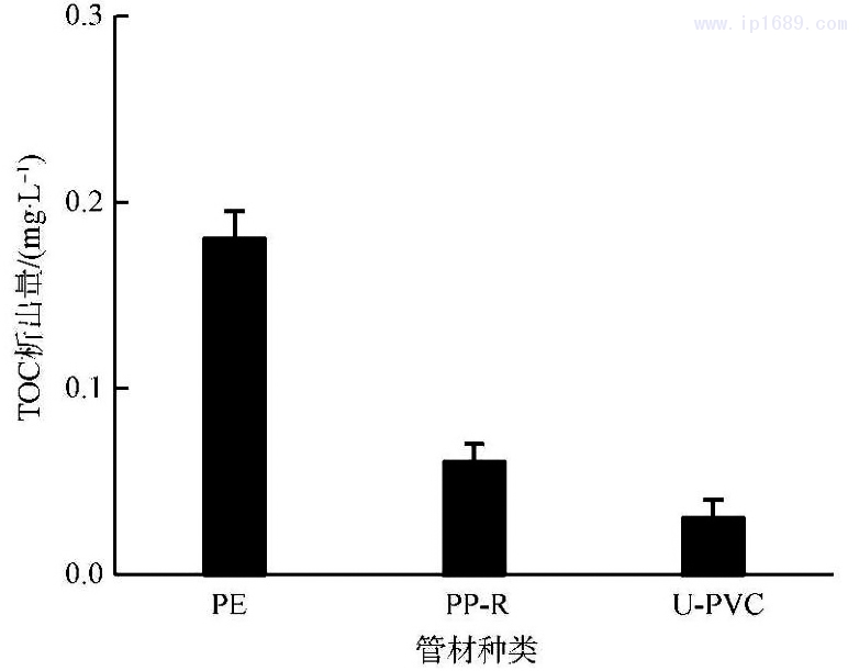 將3種管材PE、PP-R、U-PVC樣品截成長度為1m的長管段,裝人輸配水管沖洗裝置沖洗30min,沖洗完畢后,再用去離子水沖洗3次。在待測的輸配水水管中裝滿上述制備好的浸泡液,兩端用包有聚四氟乙烯薄膜的干凈橡皮塞塞緊,于25℃避光的條件下浸泡24h后,取其浸泡液,測試3種管材PE、PP-R、U-PVC在浸泡液中TOC的含量,每種管段的浸泡試驗需進行3次平行試驗。