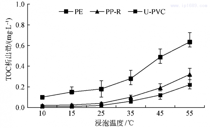 圖4為3種管材PE、PP-R、U-PVC樣品在10、15、25、35、45、55℃條件,避光浸泡24h后,TOC的析出情況變化。