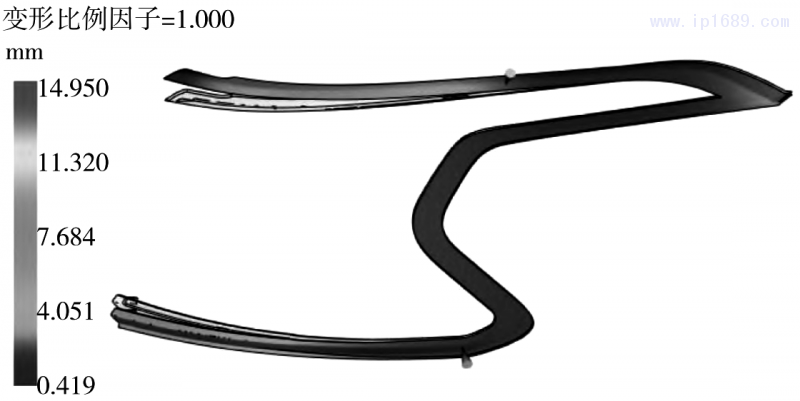 b)采用最佳參數組合進行模擬,塑件黑色部分翹曲變形量為12.120mm,降低了18.9%。此時參數組合為第一射熔體溫度242.39℃,第二射熔體溫度240.08℃,模具溫度79.99℃,保壓壓力力80.00MPa,保壓時間12.00s。