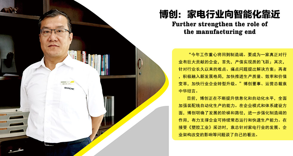 目前,博創正在不斷提升信息化和自動化水平,全面加強裝配線自動化生產的能力。在企業模式和體系建設方面,博創明確了發展的階梯和路徑,進一步強化制造端的作用,有力支撐企業可持續常態運行和快速生產能力。在接受《塑膠工業》采訪時,袁總針對家電行業的發展、企業架構改變的影響等問題談了自己的看法。