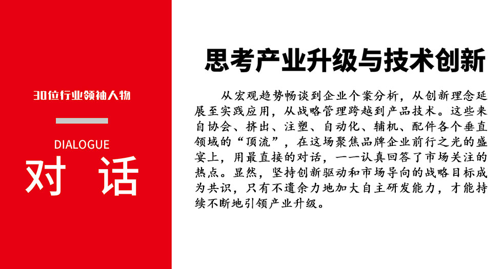 從宏觀趨勢暢談到企業個案分析,從創新理念延展至實踐應用,從戰略管理跨越到產品技術。這些來自協會、擠出、注塑、自動化、輔機、配件各個垂直領域的“頂流”,在這場聚焦品牌企業前行之光的盛宴上,用最直接的對話,一一認真回答了市場關注的熱點。顯然,堅持創新驅動和市場導向的戰略目標成為共識,只有不遺余力地加大自主研發能力,才能持續不斷地引領產業升級。