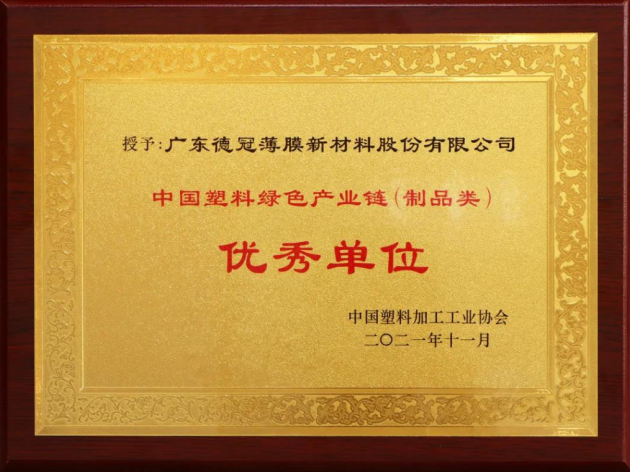 在11月3日的中國塑料加工工業協會第八次會員代表大會上,為100家會員單位頒發“2021中國綠色產業鏈優秀單位”(制品類)榮譽稱號。廣東德冠薄膜新材料股份有限公司位列其中,標志著公司長期以來推動產業鏈下游加...