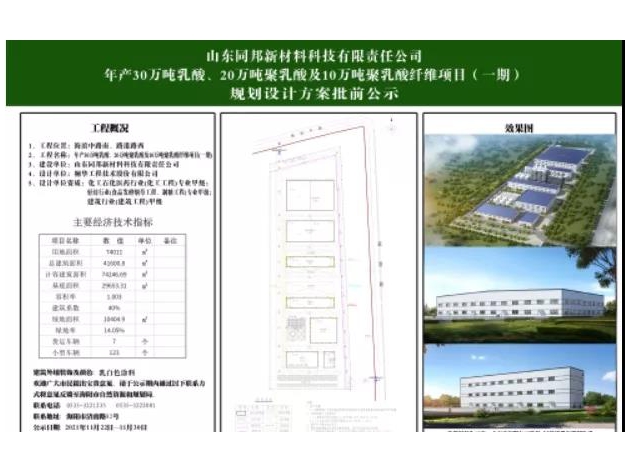 11月22日,煙臺市海陽市首個省重大項目——同邦聚乳酸項目正式開工建設。項目總投資38億元,占地651.9畝,主要新建年產30萬噸乳酸、20萬噸聚乳酸、10萬噸聚乳酸纖維生產線。