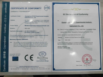 經過相關機構的審核,三奧科技的桌面式微型3D打印耗材實驗線榮獲CE認證,符合安全合格標準。