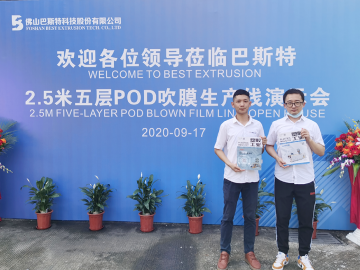 今日,佛山巴斯特科技股份有限公司(以下簡稱“巴斯特”)2.5米5層POD吹膜生產線演示會在巴斯特工廠裝配車間隆重舉行。
