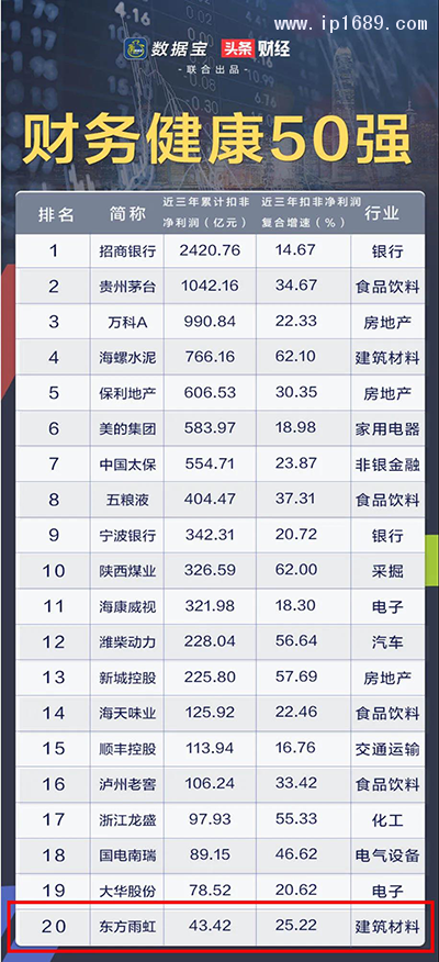 5月7日,證券時報·數據寶結合上市公司近三年年報和最新一季報的財務狀況,從各行業中挑選出基本面長期優異的個股,發布A股“財務健康50強”排行榜,東方雨虹與招商銀行、貴州茅臺、萬科A等企業入榜。