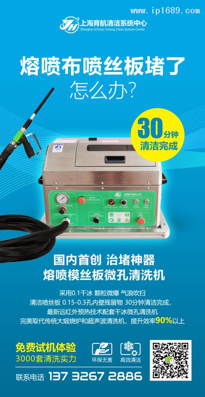 據了解,傳統的清洗機器,耗時長且在拆機過程中容易造成噴絲板撞上碰傷等,一般需要幾個小時才可以清洗干凈。而上海育航清潔系統中心(以下簡稱“育航”)的熔噴模絲板微孔清洗機——育航治堵神器,30分鐘即可清潔完成,高效快捷,對于工件來說不會產生機械破壞和明顯的溫升,其各個部位都可以得到充分的清洗,包括深孔、狹縫和凹槽。