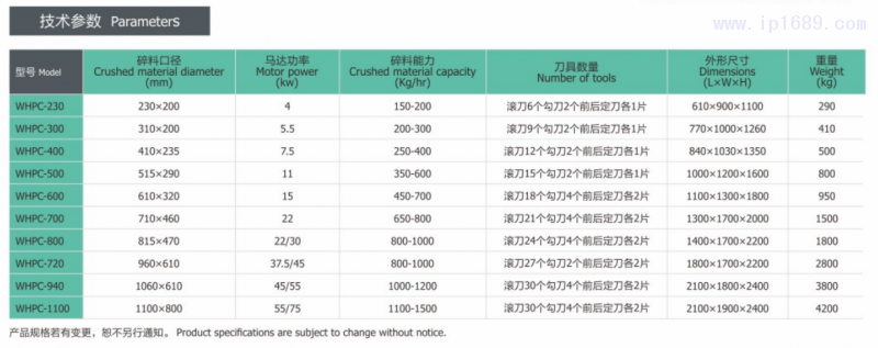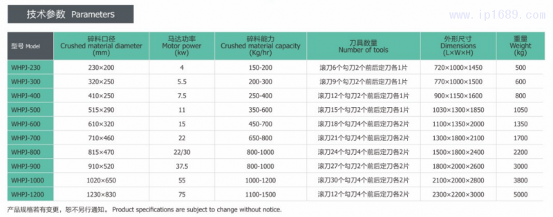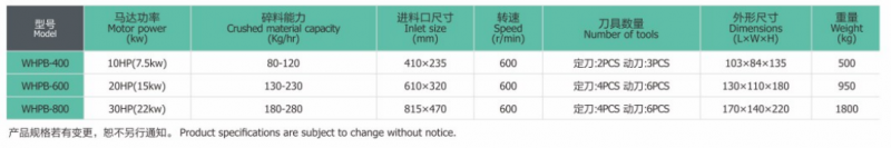 1、該機型共分為:爪刀,片刀,平刀,其中片刀適合大眾型塑膠產品的粉碎,爪刀較適合強度稍厚點的塑膠產品的粉碎,平刀較適合空心類容器,薄片塑膠的粉碎。