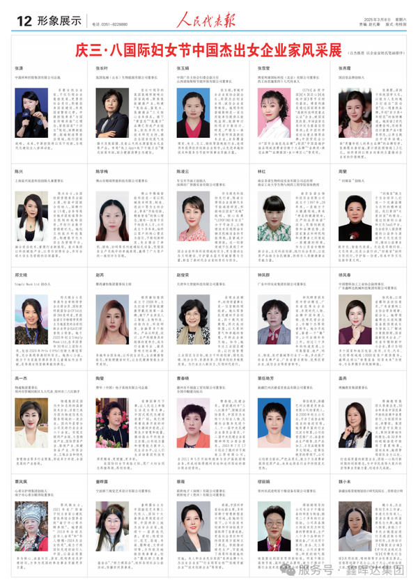 兩會之際,百杰女性攜手人民代表報出版同賀兩會三八婦女節整版???,表彰了一批在各自領域取得卓越成就的女性企業家,鑫暉達集團董事長徐鳳春女士,作為《人民代表報》認證的中國杰出女企業家榮耀登載。