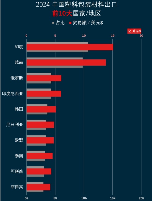 印度是中國塑料包裝材料出口的第一大目的地國家/地區。2024年,中國向印度出口了15.1 億美元,超過全年中國塑料包裝材料總出口額的1成 (10.7%)。