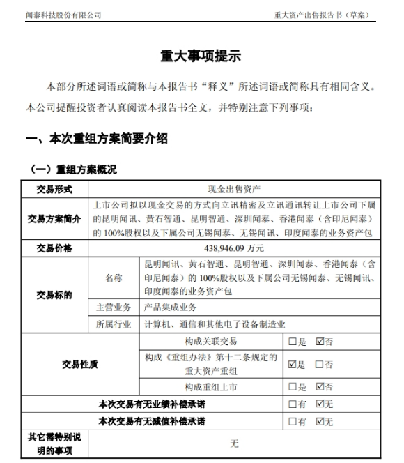 5月16日晚,聞泰科技發布了《重大資產出售報告書(草案)》,擬以現金交易方式向立訊精密及立訊通訊轉讓昆明聞訊、黃石智通、昆明智通、深圳聞泰、香港聞泰(含印尼聞泰)的100%股權以及下屬公司無錫聞泰、無錫聞訊、印度聞泰的業務資產包,交易價格為43.89億元。