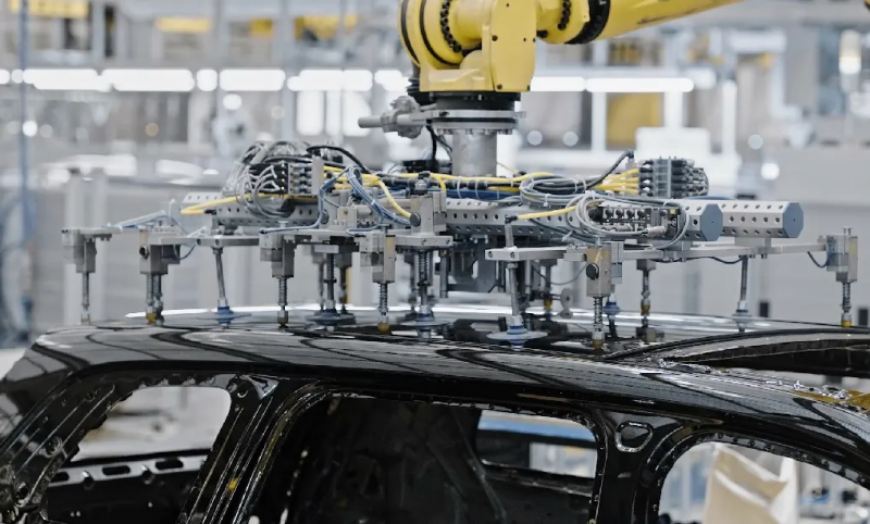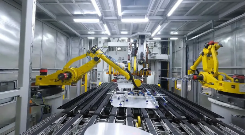 在沖壓車間,賽力斯超級工廠引入了7700T伺服壓機+FANUC機器人+100%自動裝框+整線封閉的行業頂流配置,既確保零件質量的穩定性、一致性,實現行業領先的100%自動化生產。