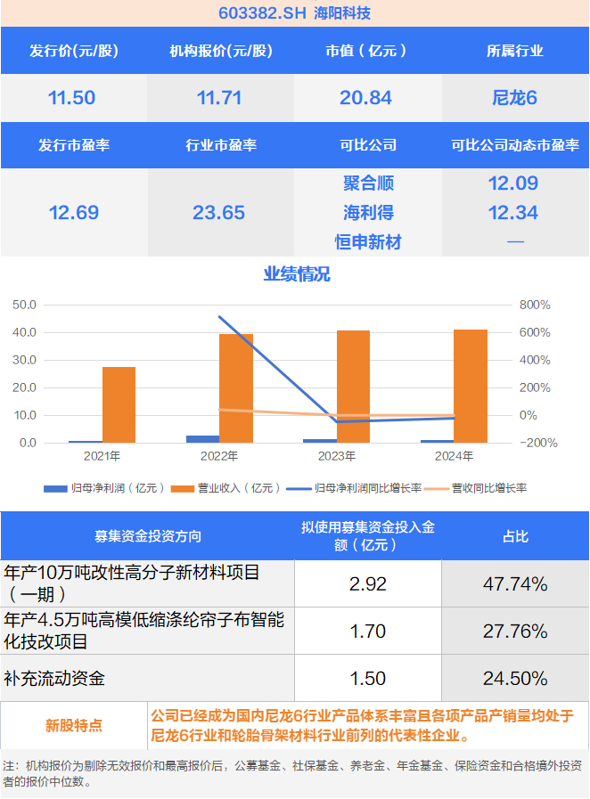 6月12日,新股上市,為滬市主板的海陽科技(603382.SH),該公司系國內從事尼龍6系列產品研發、生產和銷售的主要企業之一,已經形成集切片、絲線以及簾子布完整的尼龍6系列產品體系。