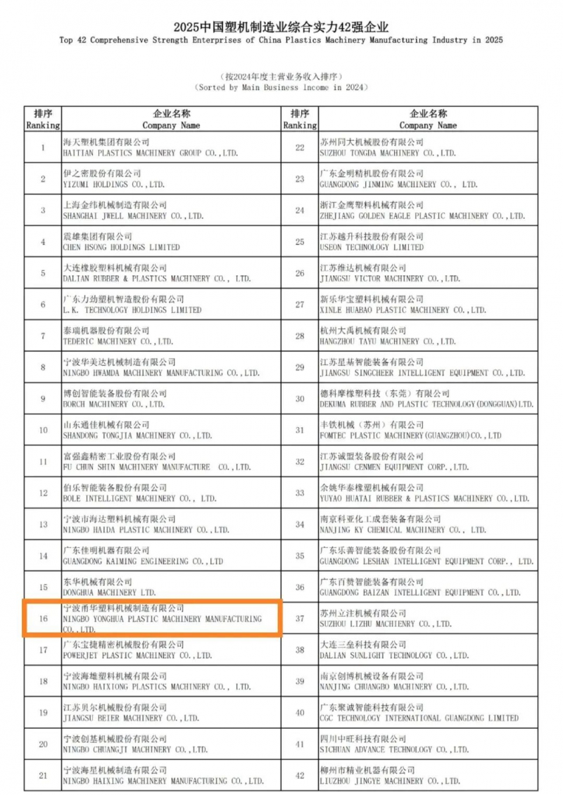 [導讀] 近日,中國塑料機械工業協會正式發布“2025中國塑料機械行業優勢企業”評選結果,寧波甬華塑料機械制造有限公司憑借扎實的綜合實力與持續創新的技術能力,成功入選“中國塑機制造綜合實力48強企業”第16名!