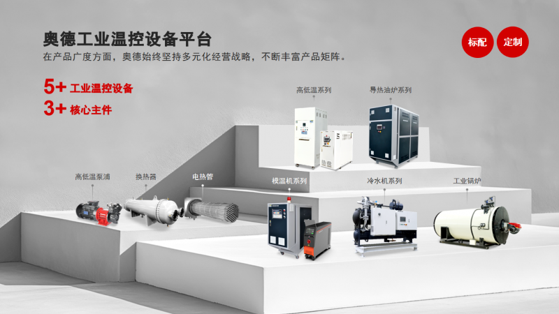 隨著奧德常大電熱的成立,奧德工業溫控設備產業鏈平臺日趨完善。從模溫機、冷水機、鍋爐三大溫控設備,到高低溫泵浦、換熱器、電加熱管三大核心主件,歷經二十余載深耕,奧德已構建起從關鍵部件到整機系統、從通用設備到高端定制的一體化溫控解決方案能力。