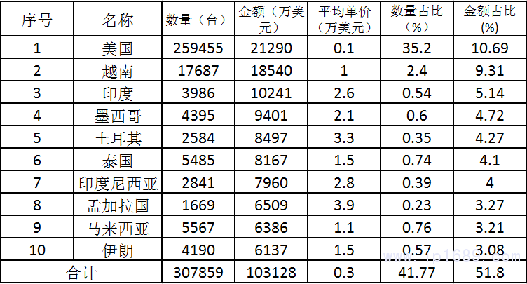 2017年1~11月,我國塑機出口市場排在前10位的國家中,出口至美國、印度、墨西哥、孟加拉國和馬來西亞增長較快,而出口至印度尼西亞和伊朗下降較多。其中,出口至美國市場的數量為259455臺,同比增長79.21%,主要產品為3D打印機,數量占出口美國塑機市場的83.93%。