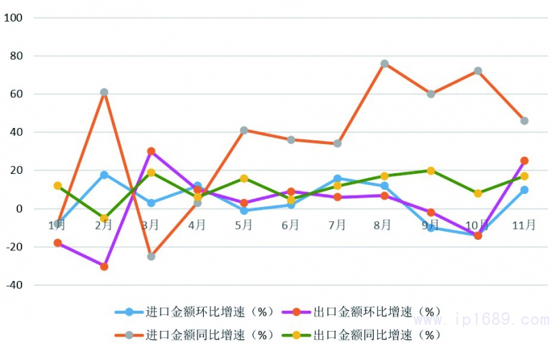 圖3 2017年1-11月我國塑機進出口金額增速走勢